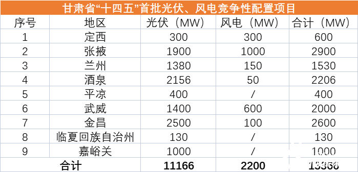 近日,記者對甘肅“十四五”首批風光競配項目做了統(tǒng)計,相比于此前的統(tǒng)計,本次梳理規(guī)模共計13.366GW,其中光伏11.166GW,風電2.2GW。
