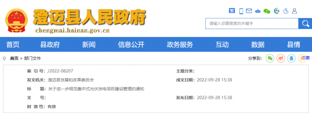 9月28日,澄邁縣政府網(wǎng)發(fā)布“關(guān)于進一步規(guī)范集中式光伏發(fā)電項目建設(shè)管理的通知”。