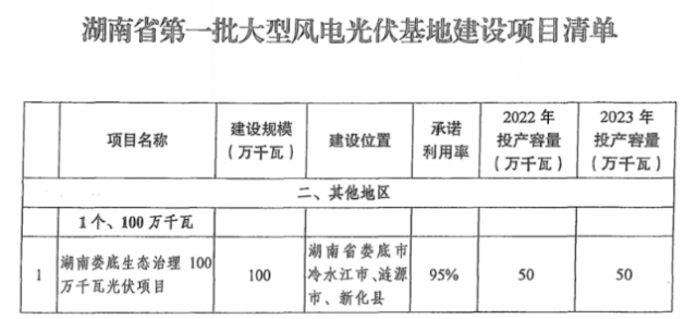 第一批風(fēng)光大基地名單中的另一項目,湖南婁底生態(tài)治理100萬千瓦光伏項目,首批500MW將于2022年10月30日前并網(wǎng)。