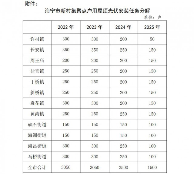 按照“政府補助企業(yè)投資運維,居民讓出屋頂免費用電”的原則,統(tǒng)籌推進我市新村集聚點居民住房屋頂規(guī)?;植际焦夥ㄔO,進一步轉變城鄉(xiāng)用能方式,優(yōu)化能源結構、提升利用效率,助力共同富裕,力爭到2025年,全市建成1萬戶居民住房屋頂光伏項目,努力打造共建共用共享綠色能源的“海寧樣板”。
