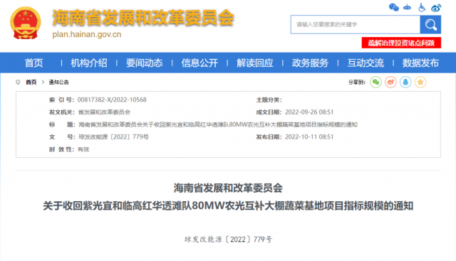 海南省發(fā)展和改革委員會關于收回紫光宜和臨高紅華透灘隊80MW農(nóng)光互補大棚蔬菜基地項目指標規(guī)模的通知