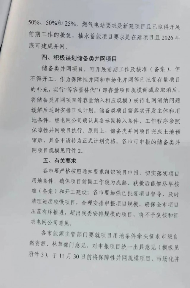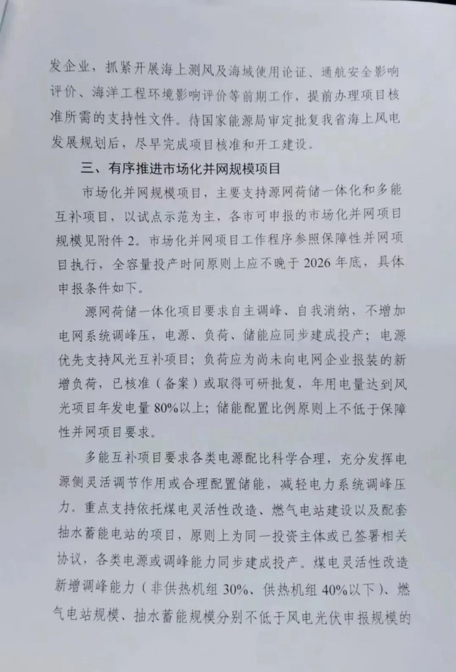 市場化項目參照保障性并網項目執(zhí)行,源網荷儲一體化項目年用電量要達到風、光項目年發(fā)電量的80%以上,儲能配置要求不得低于保障性項目。多能互補項目煤電新增調峰能力、燃氣電站、抽水蓄能規(guī)模不得低于風、光申報規(guī)模的50%、50%、25%。市場化項目全容量投產時間不晚于2026年底。