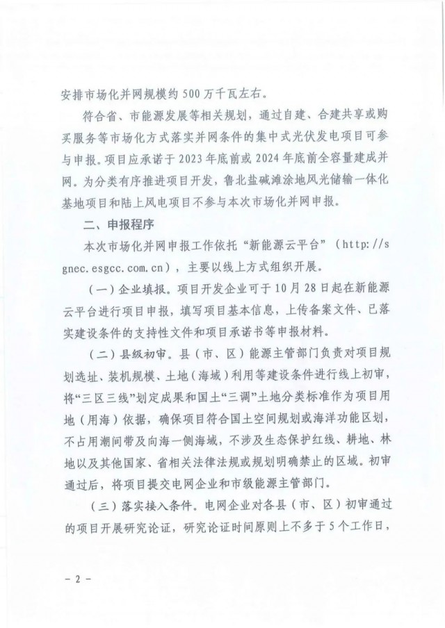 符合省、市能源發(fā)展等相關(guān)規(guī)劃,通過自建、合建共享或購買服務(wù)等市場化方式落實并網(wǎng)條件的集中式光伏發(fā)電項目可參與申報。項目應(yīng)承諾于2023年底前或2024年底前全容量建成并網(wǎng)。為分類有序推進項目開發(fā),魯北鹽堿灘涂地風(fēng)光儲輸一體化基地項目和陸上風(fēng)電項目不參與本次市場化并網(wǎng)申報。