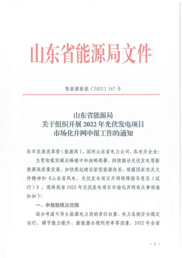 為貫徹落實碳達峰碳中和戰(zhàn)略部署,持續(xù)推動光伏發(fā)電等新能源高質(zhì)量發(fā)展,加快規(guī)劃建設(shè)新型能源體系,根據(jù)國家有關(guān)文件精神和《山東省風(fēng)電、光伏發(fā)電項目并網(wǎng)保障指導(dǎo)意見(試行)》,現(xiàn)將我省2022年光伏發(fā)電項目市場化并網(wǎng)有關(guān)事項通知如下: