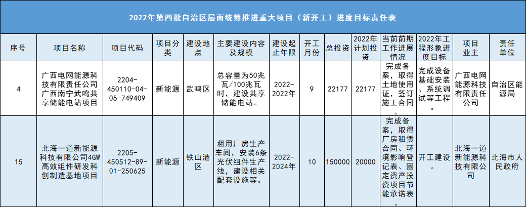 11月1日廣西壯族自治區(qū)重大項(xiàng)目建設(shè)推進(jìn)領(lǐng)導(dǎo)小組辦公室印發(fā)2022年第四批自治區(qū)層面統(tǒng)籌推進(jìn)重大項(xiàng)目方案的通知。其中,8個(gè)風(fēng)光項(xiàng)目進(jìn)入2022年第四批自治區(qū)層面統(tǒng)籌推進(jìn)重大項(xiàng)目(預(yù)備)進(jìn)度目標(biāo)責(zé)任表;2個(gè)光伏等新能源項(xiàng)目進(jìn)入2022年第四批自治區(qū)層面統(tǒng)籌推進(jìn)重大項(xiàng)目(新開工)進(jìn)度目標(biāo)責(zé)任表。