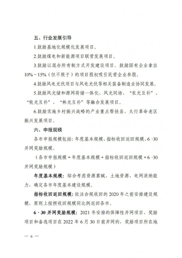 同時(shí),《方案》提出:鼓勵(lì)基地化規(guī)模化發(fā)展項(xiàng)目,鼓勵(lì)煤電和新能源項(xiàng)目聯(lián)營(yíng)發(fā)展項(xiàng)目,鼓勵(lì)以混合所有制方式開(kāi)發(fā)建設(shè)項(xiàng)目,鼓勵(lì)國(guó)有企業(yè)拿出10%~ 15%(但不限于)的項(xiàng)目股權(quán)吸引民營(yíng)企業(yè)參股,鼓勵(lì)風(fēng)電光伏項(xiàng)目與風(fēng)電光伏等相關(guān)裝備制造業(yè)協(xié)同發(fā)展,鼓勵(lì)風(fēng)光儲(chǔ)和源網(wǎng)荷儲(chǔ)一體化、風(fēng)光同場(chǎng)、“農(nóng)光互補(bǔ)”、“牧光互補(bǔ)”、“林光互補(bǔ)”等融合發(fā)展項(xiàng)目,鼓勵(lì)實(shí)施鄉(xiāng)村振興戰(zhàn)略的產(chǎn)業(yè)重點(diǎn)幫扶縣、太行革命老區(qū)振興發(fā)展項(xiàng)目。
