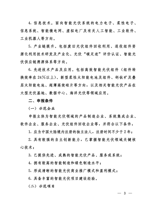 6.先進(jìn)技術(shù)產(chǎn)品及應(yīng)用。包括高效智能光伏組件(組件轉(zhuǎn)換效率在24%以上)、新型柔性太陽能電池及組件、鈣鈦礦及疊層太陽能電池、超薄高效硅片等方向,以及相關(guān)智能光伏產(chǎn)品在大型光伏基地、數(shù)據(jù)中心、海洋光伏等領(lǐng)域應(yīng)用。