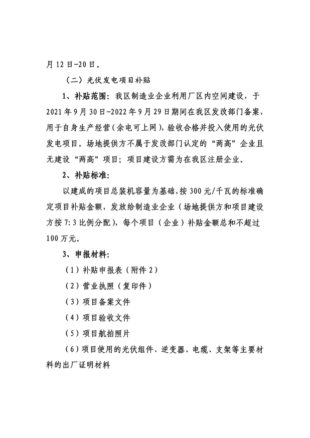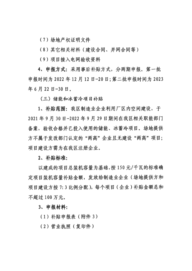 為進一步貫徹落實中央、省關于振興實體經濟和市“產業(yè)第一、制造業(yè)優(yōu)先”的決策部署,鼓勵企業(yè)建設光伏發(fā)電、儲能和冰蓄冷項目,支持制造業(yè)發(fā)展,有力有序有效做好碳達峰、碳中和工作,根據《關于印發(fā)〈肇慶高新區(qū)節(jié)約用電支持制造業(yè)發(fā)展補貼資金申報指南〉的通知》(以下簡稱《指南》)等有關規(guī)定,結合我區(qū)實際,現(xiàn)就申報光伏發(fā)電、儲能和冰蓄冷項目補貼有關事項進一步明確如下: