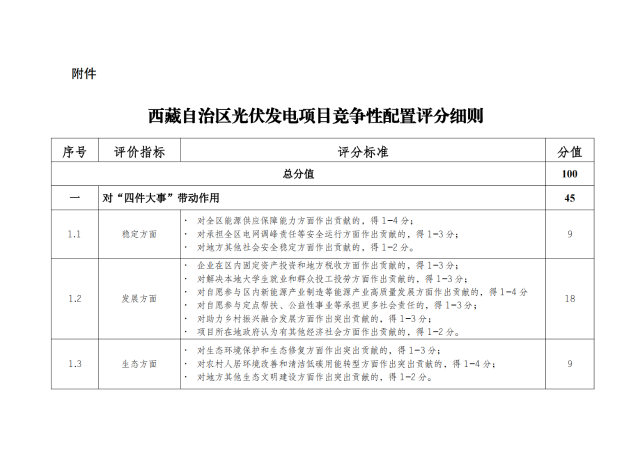 西藏自治區(qū)光伏發(fā)電項目競爭性配置評分細則規(guī)定了儲能配置方案,評分滿分為100分,其中儲能滿分為10分。新建儲能容量按光伏備案容量的20%,儲能時長4小時配置的,得5分;在此基礎(chǔ)上儲能時長每增加1小時,增加1分,直至滿分。