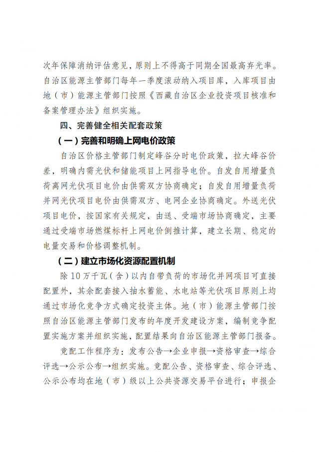 妥善解決光伏棄光限電問題 推進可再生能源利用示范區(qū)建設(shè),提高電能在終端用能中 的比例,加快新型儲能建設(shè),深度挖掘調(diào)度潛力。加強藏電外送力度,擴大區(qū)外市場消納能力。推進存量和新增光伏電站配置儲能、電網(wǎng)側(cè)儲能建設(shè),積極協(xié)調(diào)電網(wǎng)企業(yè)、金融機構(gòu)等部門,給予優(yōu)先調(diào)度、綠色金融等激勵政策,有效緩解全區(qū)棄光和局部限電的矛盾。