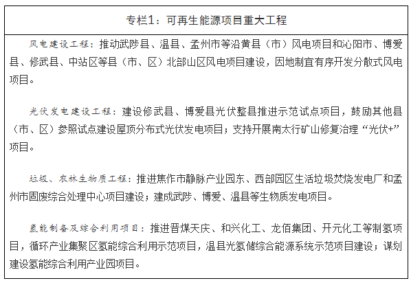 加大風能開發(fā)力度。堅持風電發(fā)展與生態(tài)環(huán)境保護有機統(tǒng)一,堅守生態(tài)環(huán)保底線,統(tǒng)籌考慮全市風能資源、自然保護、電網(wǎng)消納等因素,積極推動風能開發(fā)利用。加快推進馬村區(qū)華潤、溫縣潔源等60萬千瓦存量風電項目建設(shè),統(tǒng)籌謀劃武陟縣、溫縣、孟州市等縣(市)風力資源,打造沿黃百萬千瓦風電走廊,力爭到2025年全市風電并網(wǎng)容量累計達到120萬千瓦以上。