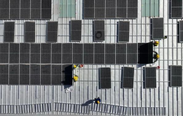 3月16日,工人在唐山市蘆臺經(jīng)濟(jì)開發(fā)區(qū)一家企業(yè)廠房屋頂上安裝太陽能光伏發(fā)電板(無人機(jī)照片)。