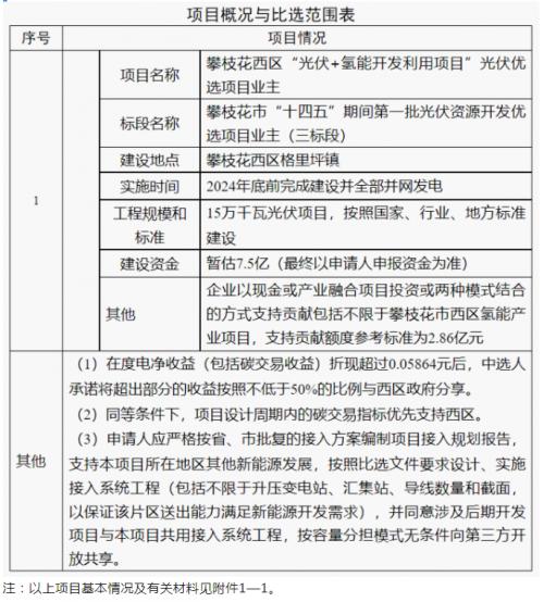 該項目為攀枝花西區(qū)“光伏+氫能開發(fā)利用項目”,為攀枝花市“十四五”期間第一批光伏資源開發(fā)的三標(biāo)段。建設(shè)地點在攀枝花西區(qū)格里坪鎮(zhèn),實施時間要求2024年底前完成建設(shè)并全部并網(wǎng)發(fā)電,工程規(guī)模和標(biāo)準(zhǔn)為15萬千瓦光伏項目。建設(shè)資金暫估7.5億(不含送出),配套建設(shè)相應(yīng)送出線路及變電站等設(shè)施。