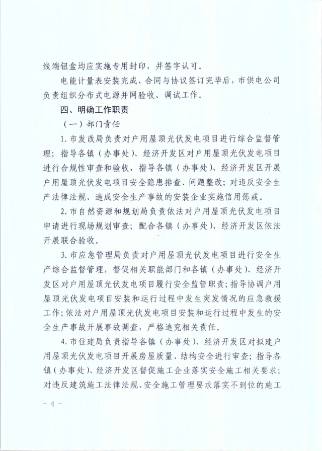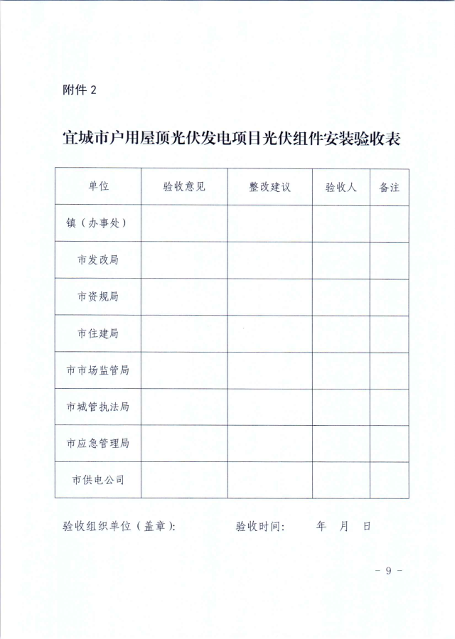 屋頂光伏在組件安裝完成后,業(yè)主需向?qū)俚劓?zhèn)、經(jīng)濟開發(fā)區(qū)提出驗收申請,然后會同市發(fā)改局、自然資源和規(guī)劃局、住建局、市場監(jiān)管局、城管執(zhí)法局、應(yīng)急管理局、供電公司等部門聯(lián)合驗收并出具驗收意見。