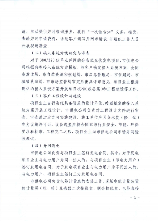 并網(wǎng)方面,則是對于380/220伏單點并網(wǎng)的分布式光伏發(fā)電項目,市供電公司根據(jù)典型接入系統(tǒng)方案模板,與客戶確定接入系統(tǒng)方案,會同市發(fā)改局、市自然資源和規(guī)劃局、市應(yīng)急管理局、市住建局、市城管執(zhí)法局、市市場監(jiān)管局審定后出具評審意見。項目業(yè)主根據(jù)確認(rèn)的接入系統(tǒng)方案開展項目核準(zhǔn)(或備案)和工程建設(shè)等工作。