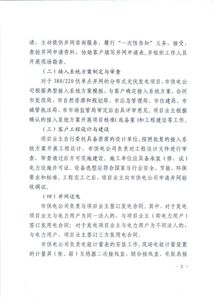并網(wǎng)方面,則是對于380/220伏單點并網(wǎng)的分布式光伏發(fā)電項目,市供電公司根據(jù)典型接入系統(tǒng)方案模板,與客戶確定接入系統(tǒng)方案,會同市發(fā)改局、市自然資源和規(guī)劃局、市應(yīng)急管理局、市住建局、市城管執(zhí)法局、市市場監(jiān)管局審定后出具評審意見。項目業(yè)主根據(jù)確認的接入系統(tǒng)方案開展項目核準(或備案)和工程建設(shè)等工作。