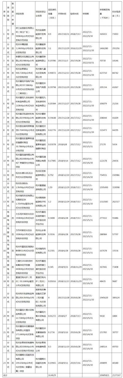 2023年富陽區(qū)非居民光伏發(fā)電項(xiàng)目申請區(qū)級財(cái)政補(bǔ)貼情況匯總表