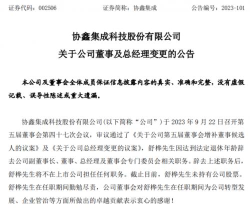 9月23日,協(xié)鑫集成發(fā)布《關(guān)于公司董事及總經(jīng)理變更公告》。公告顯示,舒樺因達(dá)法定退休年齡辭去公司副董事長、董事、總經(jīng)理以及董事會專門委員會相關(guān)職務(wù),且不再擔(dān)任公司任何職務(wù)。