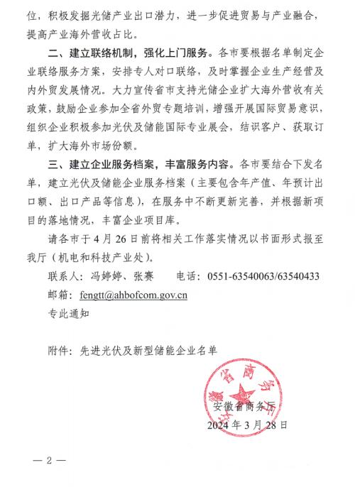 文件要求,各市要根據(jù)名單制定企業(yè)聯(lián)絡(luò)服務(wù)方案,安排專人對(duì)口聯(lián)絡(luò),及時(shí)掌握企業(yè)生產(chǎn)經(jīng)營(yíng)及內(nèi)外貿(mào)發(fā)展情況。大力宣傳省市支持光儲(chǔ)企業(yè)擴(kuò)大海外營(yíng)收有關(guān)政策,鼓勵(lì)企業(yè)參加全省外貿(mào)專題培訓(xùn),增強(qiáng)開(kāi)展國(guó)際貿(mào)易意識(shí)組織企業(yè)積極參加光伏及儲(chǔ)能國(guó)際專業(yè)展會(huì),結(jié)識(shí)客戶、獲取訂單,擴(kuò)大海外市場(chǎng)份額。