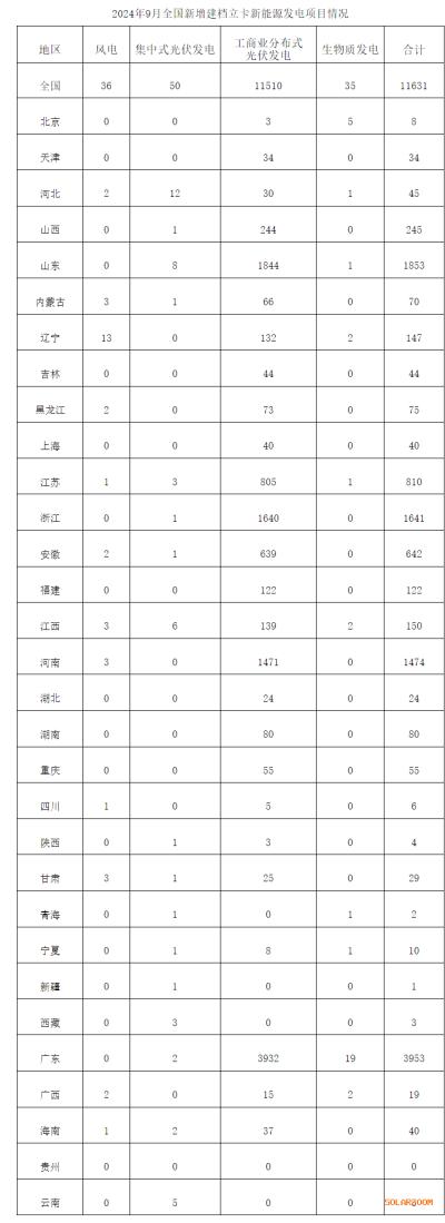 9月,全國新增建檔立卡新能源發(fā)電(不含戶用光伏)項目共11631個,其中風(fēng)電項目36個,光伏發(fā)電項目11560個(集中式光伏發(fā)電項目50個,工商業(yè)分布式光伏發(fā)電項目11510個),生物質(zhì)發(fā)電項目35個。
