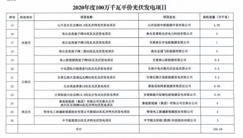 3月25日,甘肅省發(fā)改委發(fā)布《關(guān)于加快推進(jìn)全省新能源存量項(xiàng)目建設(shè)工作》的通知。文件明確,甘肅省目前新能源存量項(xiàng)目約600萬千瓦。其中,光伏發(fā)電項(xiàng)目1.23GW包括:酒湖直流工程配套23.5萬千瓦光伏發(fā)電項(xiàng)目以及《國家發(fā)展改革委辦公廳國家能源局綜合司關(guān)于公布2020年風(fēng)電、光伏發(fā)電平價(jià)上網(wǎng)項(xiàng)目的通知》(發(fā)改辦能源〔2020〕588號(hào))中尚未并網(wǎng)100萬千瓦光伏發(fā)電項(xiàng)目。