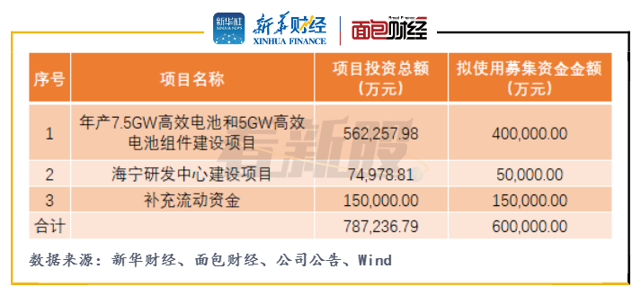 晶科能源此次擬公開發(fā)行不超過26.67億股,發(fā)行股份數(shù)量不超過發(fā)行后總股本的25%,擬募集60億元投向年產(chǎn)7.5GW高效電池和5GW高效電池組件建設(shè)項目(以下簡稱“高效電池及組件項目”)、海寧研發(fā)中心建設(shè)項目以及補充流動資金。其中高效電池及組件項目擬使用募集資金金額為40億元,占此次擬募集資金總額的66.67%,是此次募資的主要投資項目。