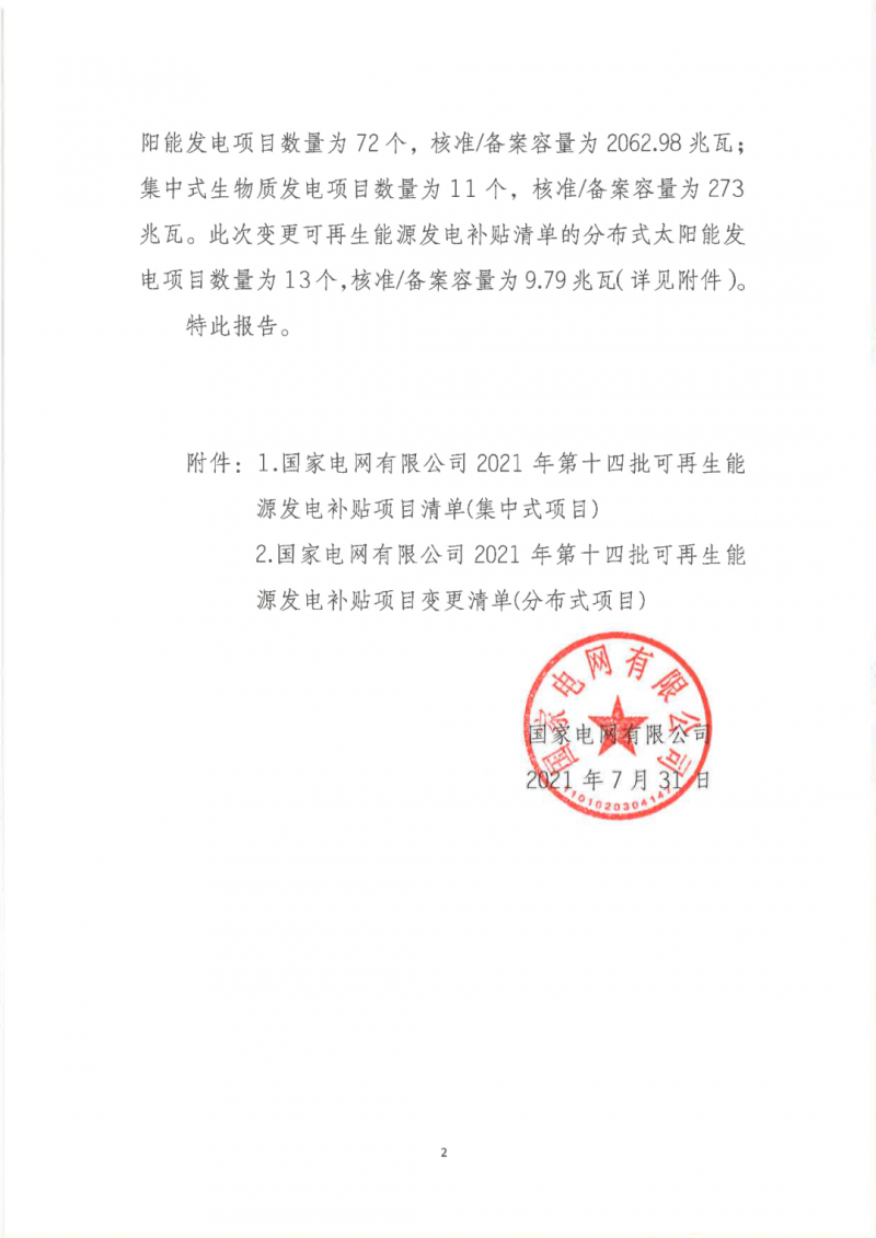 2021年7月31日,我公司已將完成公示的2021年第十四批可再生能源發(fā)電項目補貼項目清單上報國家主管部門,第十四批項目清單及后續(xù)項目審核進展情況,請登錄新能源云平臺查詢。