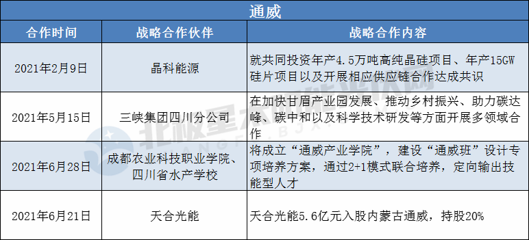 據(jù)北極星太陽能光伏網(wǎng)不完全統(tǒng)計,2021年初至今,已有晶科、通威、晶澳、特變電工、天合光能5家光伏企業(yè)在通過增資入股、合資擴產(chǎn)形式成為深度戰(zhàn)略合作伙伴。