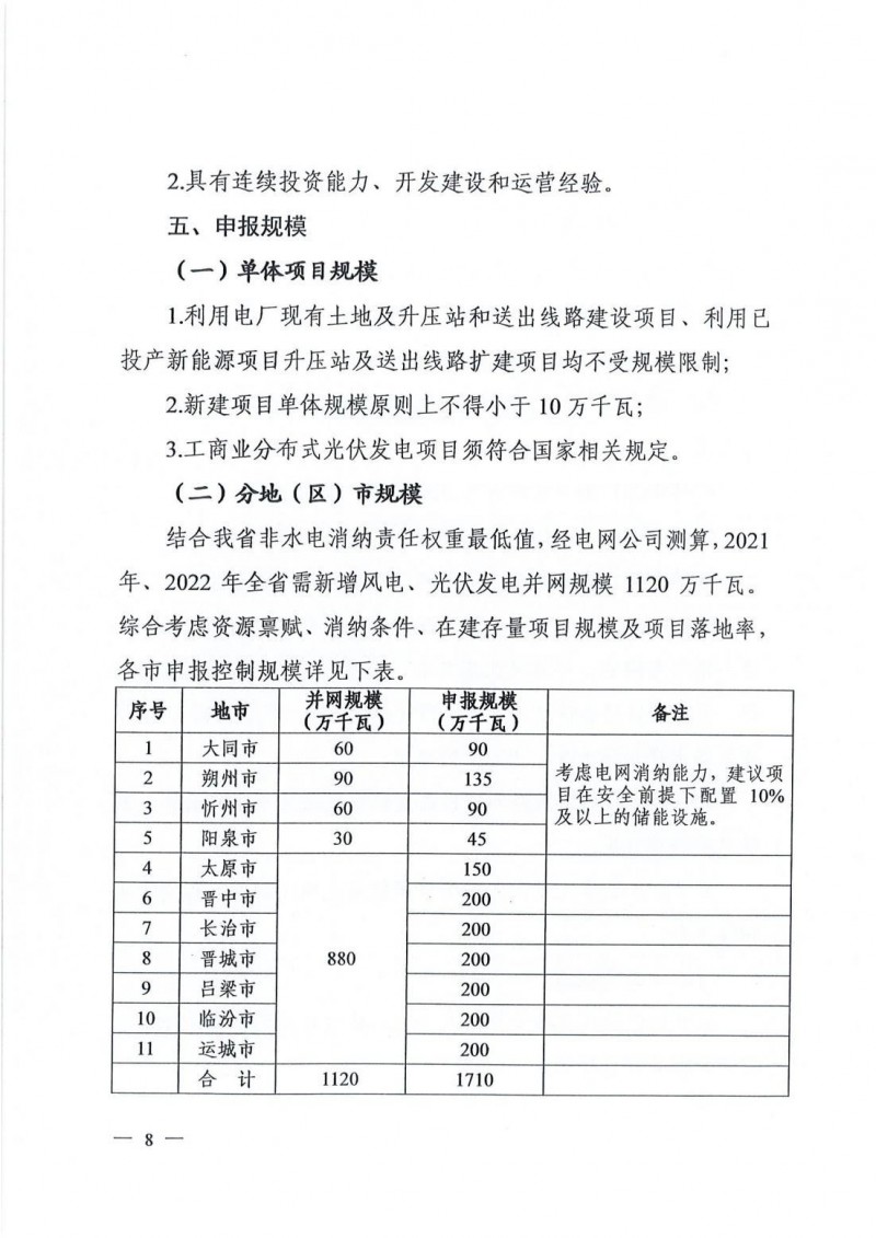 結(jié)合山西省非水電消納責(zé)任權(quán)重最低值,經(jīng)電網(wǎng)公司測(cè)算,2021年、2022年山西省需新增風(fēng)電、光伏發(fā)電并網(wǎng)規(guī)模1120萬千瓦。文件明確晉北三市暫不考慮風(fēng)電競配項(xiàng)目,其余地市風(fēng)光發(fā)電項(xiàng)目規(guī)模按2:8比例申報(bào)。