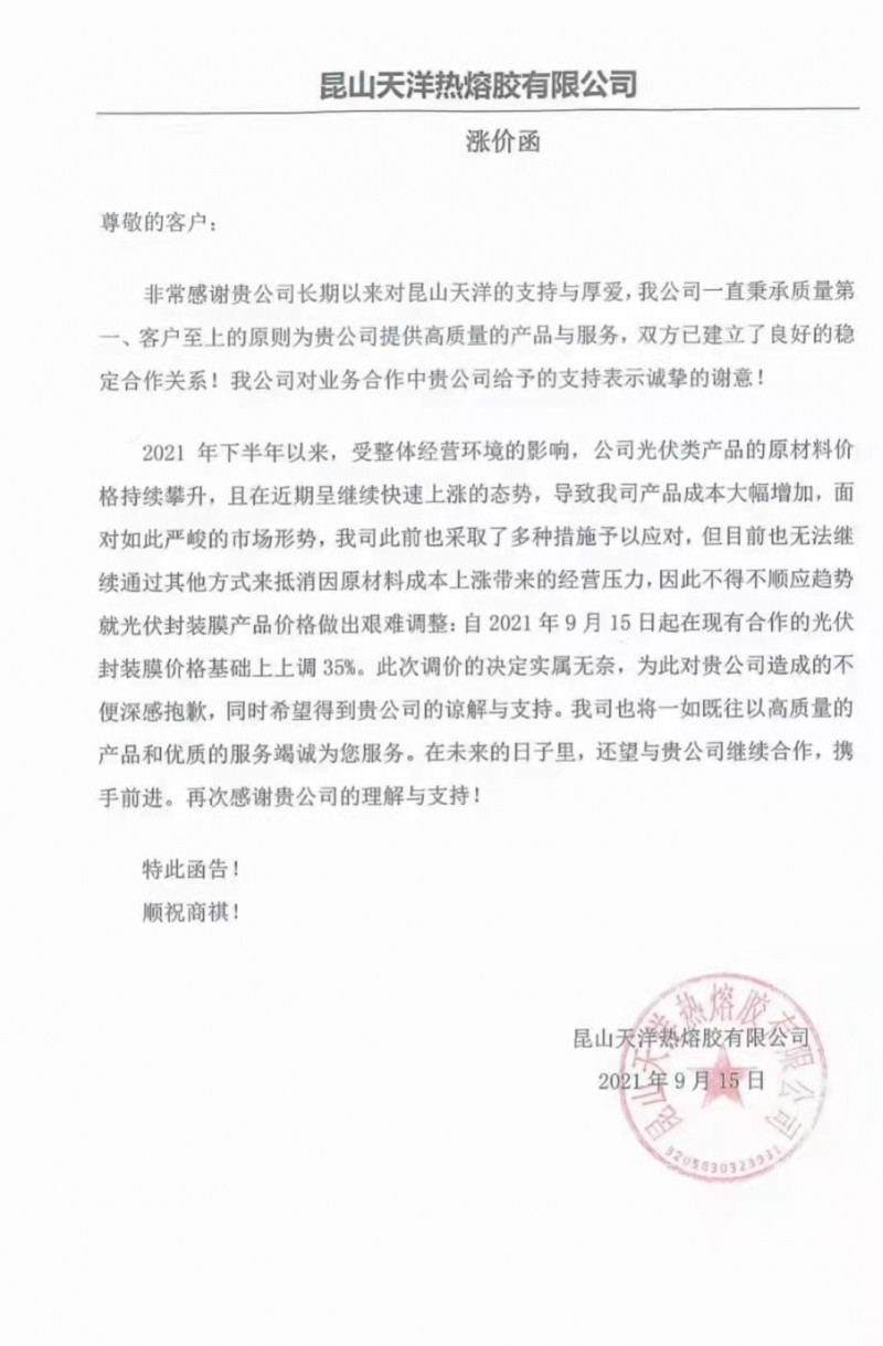 據(jù)專業(yè)人士分析,膠膜本次漲價反應(yīng)到組件端,將帶來單玻組件成本增加2分/W,雙玻組件成本增加5分/W。以下為兩家企業(yè)漲價函:
