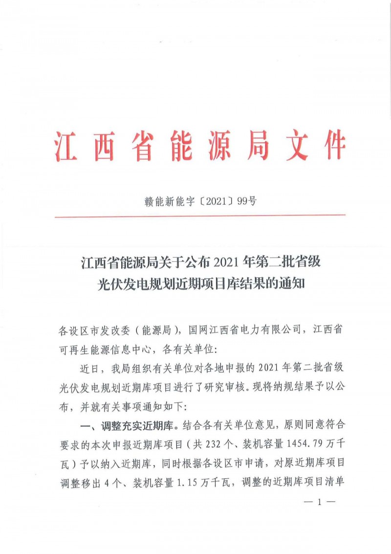 江西省2021年第二批光伏發(fā)電規(guī)劃近期庫(kù)調(diào)整納入項(xiàng)目共232個(gè)、1454.79萬(wàn)千瓦項(xiàng)目,其中