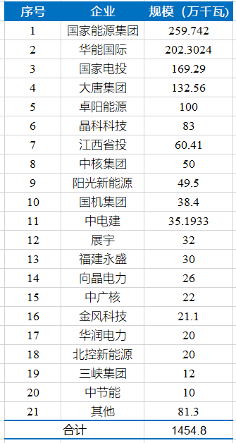 從投資企業(yè)來(lái)看,國(guó)家能源集團(tuán)及參股的項(xiàng)目的規(guī)模最大,約為2.6GW;華能及參股的項(xiàng)目的規(guī)模也超過(guò)2GW;國(guó)家電投、大唐、卓陽(yáng)能源均獲得1GW及以上規(guī)模。具體如下表所示。