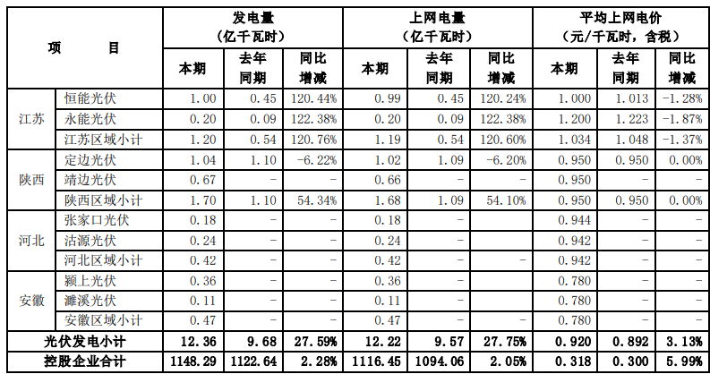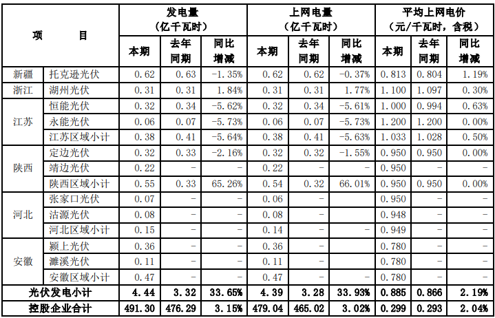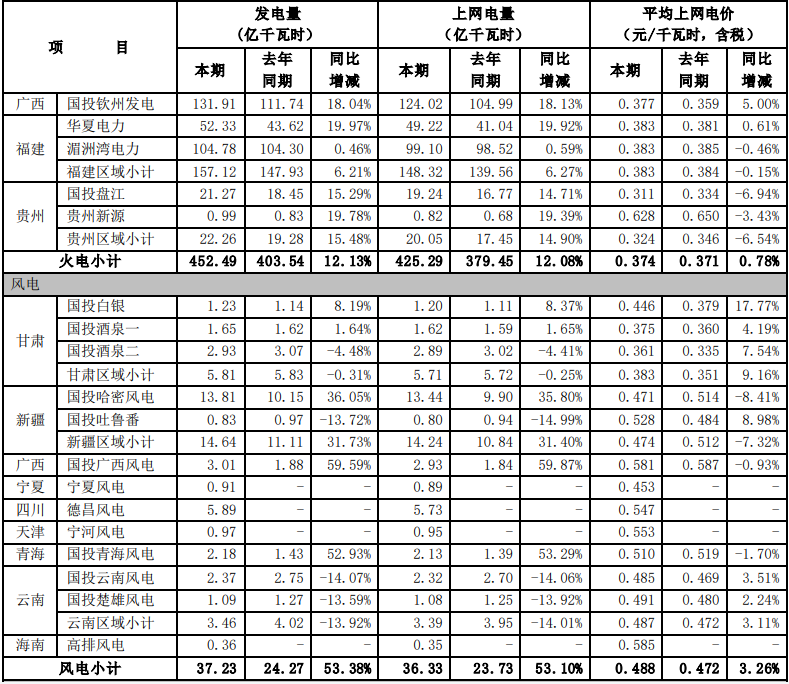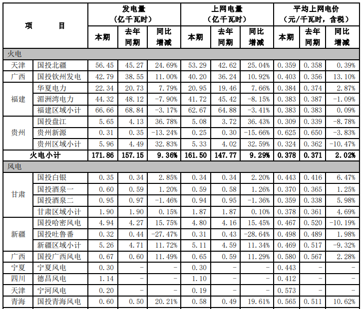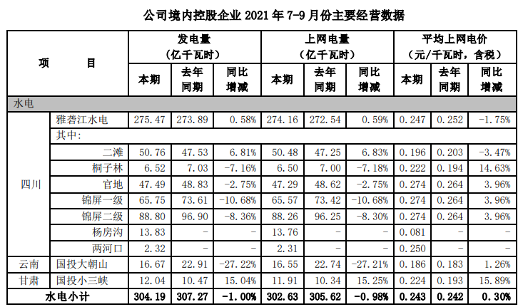 根據(jù)國(guó)投電力控股股份有限公司(以下簡(jiǎn)稱公司)境內(nèi)控股企業(yè)初步統(tǒng)計(jì), 2021年 7-9 月,公司境內(nèi)控股企業(yè)累計(jì)完成發(fā)電量491.30 億千瓦時(shí),上網(wǎng)電量479.04 億千瓦時(shí),與去年同期相比分別增加3.15%和3.02%。2021年1-9月,公司境內(nèi)控股企業(yè)累計(jì)完成發(fā)電量1148.29億千瓦時(shí),上網(wǎng)電量1116.45億千瓦時(shí), 與去年同期相比分別增加 2.28%和2.05%。 2021年7-9 月,公司境內(nèi)控股企業(yè)平均上網(wǎng)電價(jià)0.299 元/千瓦時(shí),與去年同期相比增加了 2.04%。