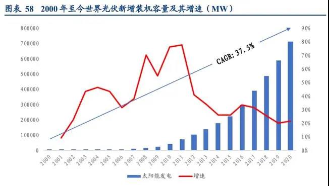 2014 年之后,光伏發(fā)電行業(yè)經(jīng)過(guò)優(yōu)勝劣汰的篩選,發(fā)電成本持續(xù)大幅下降,投資回報(bào)重 新獲得平衡,全球更多的國(guó)家加入到支持光伏發(fā)電的行列,具有技術(shù)研發(fā)優(yōu)勢(shì)、規(guī)模優(yōu)勢(shì)的企業(yè)涌現(xiàn)。縱觀歷史,近20年間光伏增速年均復(fù)合增長(zhǎng)率達(dá) 37.5%。