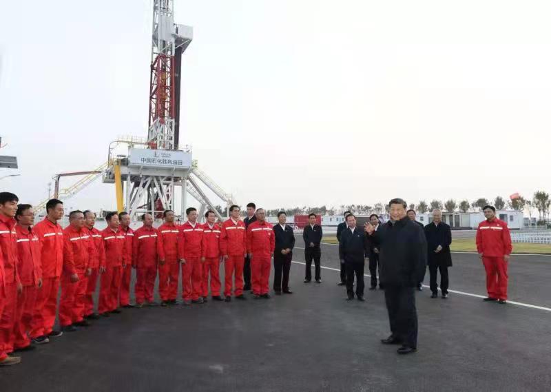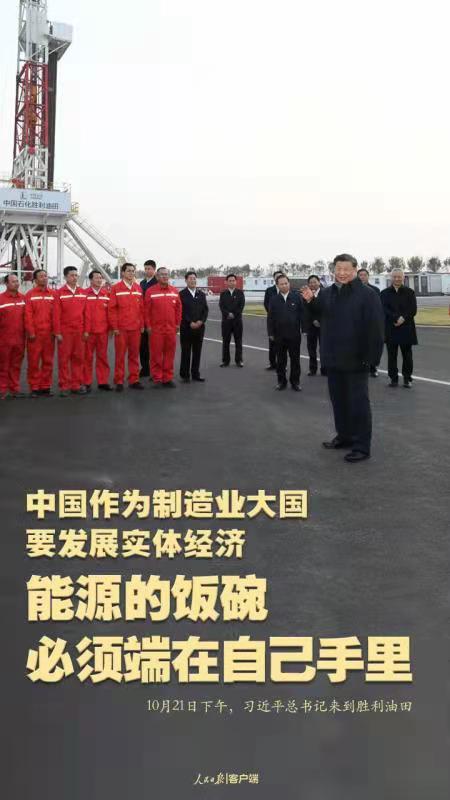 10月21日下午,習近平總書記來到勝利油田,登上鉆井平臺,察看作業(yè)情況,看望慰問石油工人。今年是勝利油田發(fā)現(xiàn)60周年。習近平代表黨中央向廣大石油職工致以誠摯問候。習近平指出,石油能源建設(shè)對我們國家意義重大,中國作為制造業(yè)大國,要發(fā)展實體經(jīng)濟,能源的飯碗必須端在自己手里。希望你們再創(chuàng)佳績、再立新功。