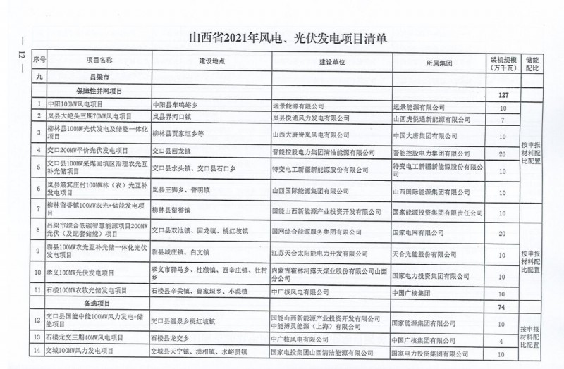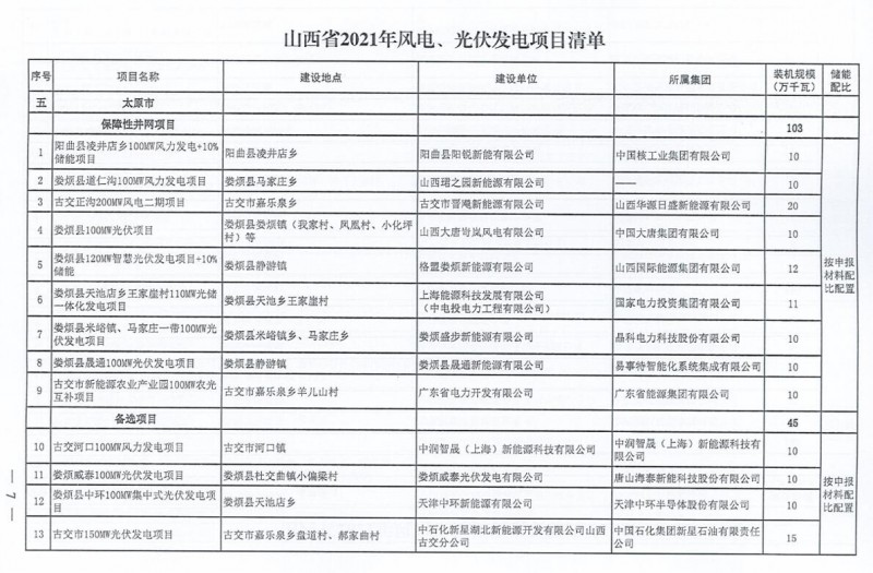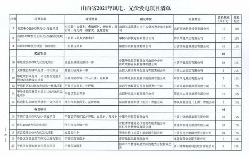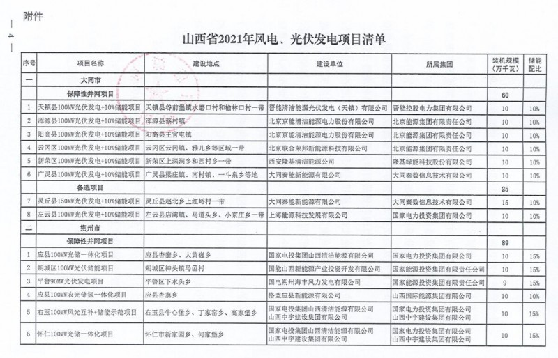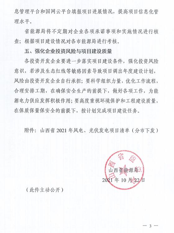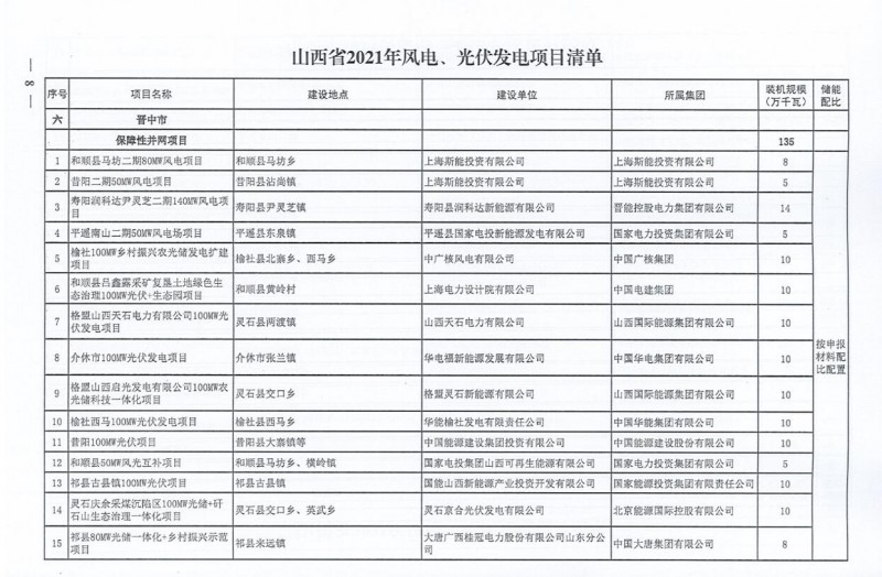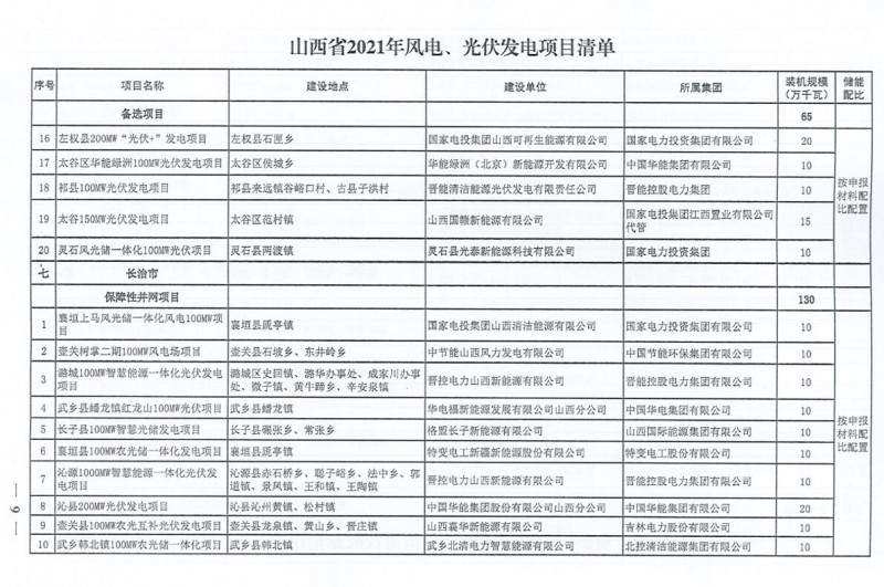 10月22日,山西省能源局下達(dá)2021年度風(fēng)電、光伏發(fā)電保障性并網(wǎng)年度建設(shè)計(jì)劃。風(fēng)、光合計(jì)17.792GW,其中保障性11.2GW+獎(jiǎng)勵(lì)700MW+備選5.892GW。文件明確保障性規(guī)模與獎(jiǎng)勵(lì)規(guī)模可同步開展前期工作,優(yōu)先保證保障性并網(wǎng)項(xiàng)目和獎(jiǎng)勵(lì)項(xiàng)目并網(wǎng),如上述項(xiàng)目未能按承諾時(shí)間并網(wǎng),將視項(xiàng)目成熟度、建設(shè)進(jìn)度和接入條件等,從備選項(xiàng)目中選擇并網(wǎng)項(xiàng)目,保障完成國家下達(dá)的最低消納責(zé)任權(quán)重。