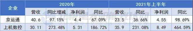 以鑄錠爐起家的京運(yùn)通從2017年開始主攻硅片業(yè)務(wù),截至2021年中,京運(yùn)通單晶硅片產(chǎn)能約8GW,另有12GW新增產(chǎn)能處于爬產(chǎn)期,預(yù)計(jì)2021年底產(chǎn)能達(dá)20GW;切割設(shè)備商上機(jī)數(shù)控從2019 年通過全資子公司弘元新材進(jìn)一步拓展單晶硅業(yè)務(wù),截至2021年中,實(shí)際產(chǎn)能20GW。2020年以及2021年上半年,京運(yùn)通、上機(jī)數(shù)控營(yíng)收及凈利潤(rùn)均實(shí)現(xiàn)了大幅增長(zhǎng),最高漲幅達(dá)464.59%,主要原因均指向硅片營(yíng)收的大增。其中,上機(jī)數(shù)控2021年上半年?duì)I收及凈利潤(rùn)均超過2020年全年。