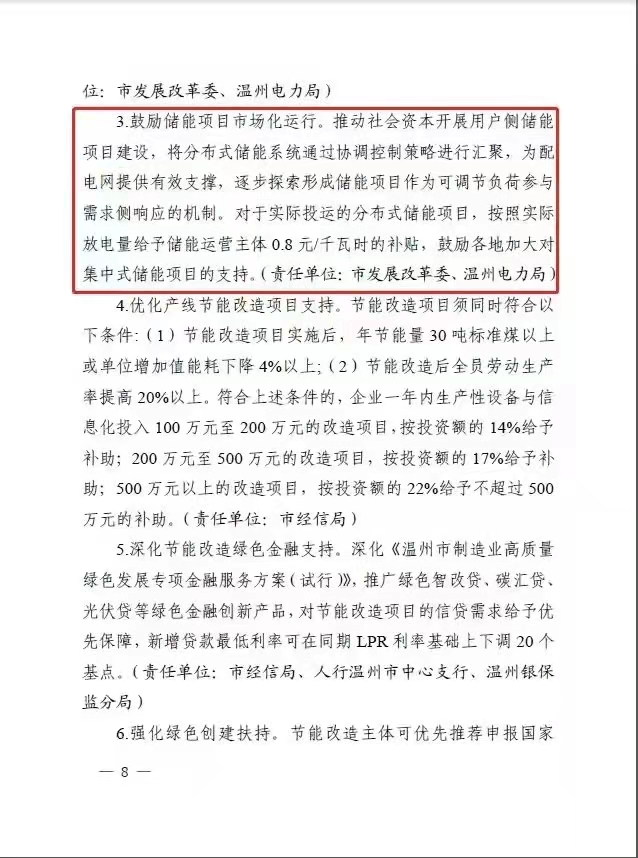 同時(shí),推動(dòng)社會(huì)資本開展用戶側(cè)儲(chǔ)能項(xiàng)目建設(shè),將分布式儲(chǔ)能系統(tǒng)通過(guò)協(xié)調(diào)控制策略進(jìn)行匯聚,為配電網(wǎng)提供有效支撐,逐步探索形成儲(chǔ)能項(xiàng)目作為可調(diào)節(jié)負(fù)荷參與需求側(cè)響應(yīng)的機(jī)制。對(duì)于實(shí)際投運(yùn)的分布式儲(chǔ)能項(xiàng)目,按照實(shí)際放電量給予儲(chǔ)能運(yùn)營(yíng)主體0.8元/千瓦時(shí)的補(bǔ)貼,鼓勵(lì)各地加大對(duì)集中式儲(chǔ)能項(xiàng)目的支持。