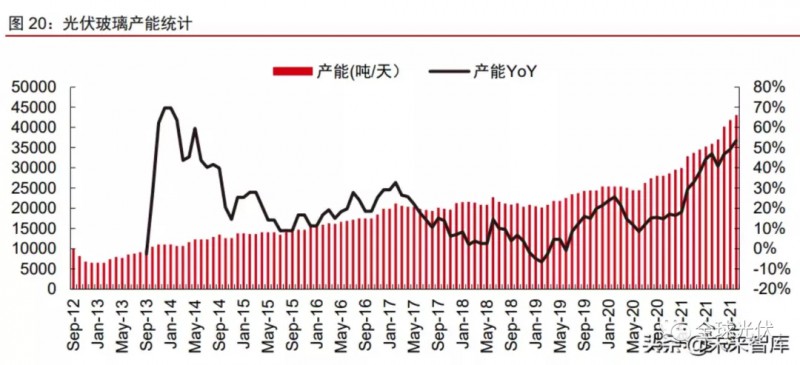 光伏玻璃產(chǎn)能迎來(lái)加速投放。由于光伏玻璃產(chǎn)能置換政策限制放寬,以及“雙碳”目標(biāo)下光伏行業(yè)長(zhǎng)期增長(zhǎng)潛力進(jìn)一步增強(qiáng),2021年以來(lái)光伏玻璃行業(yè)進(jìn)入產(chǎn)能加速投放階段。截至2021年10月,國(guó)內(nèi)光伏玻璃日熔化量約4.31萬(wàn)噸/天(+53.5%YoY)。