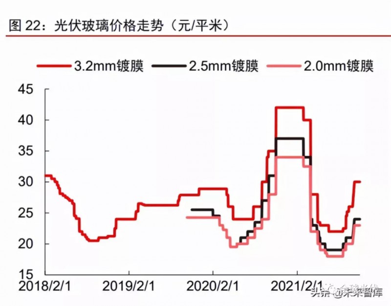 2021年光伏玻璃價(jià)格大幅回落,2022年價(jià)格或?qū)⒕S持中低位波動(dòng)。光伏玻璃供需格局的變化也反應(yīng)在企業(yè)庫(kù)存。據(jù)卓創(chuàng)資訊統(tǒng)計(jì),2021H1,隨著行業(yè)產(chǎn)能擴(kuò)張以及需求延后,光伏玻璃行業(yè)主流廠商庫(kù)存天數(shù)由年初10天以內(nèi)快速增至40天左右;受此影響,光伏玻璃價(jià)格也于4月從高點(diǎn)出現(xiàn)“腰斬式”下跌。隨著Q3后庫(kù)存逐步消化回落,以及受純堿價(jià)格大幅上漲推動(dòng),光伏玻璃價(jià)格從底部開始有所回升,目前3.2mm產(chǎn)品價(jià)格約30元/平米,2.0mm產(chǎn)品價(jià)格約23元/平米。展望2022年,我們認(rèn)為在原材料成本有望逐步回落,且行業(yè)供需格局總體保持寬松的情況下,光伏玻璃價(jià)格有望在中低水平整體保持穩(wěn)定,預(yù)計(jì)3.2mm和2.0mm玻璃價(jià)格或?qū)⒃?5元/平米和20元/平米的中樞附件波動(dòng)。