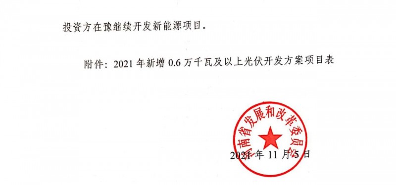 11月5日,河南省發(fā)改委下發(fā)《關于下達 2021年新增0.6萬千瓦及以上光伏項目開發(fā)方案的通知》。文件指出,對于不新增用地、利用固定建筑物及其附屬場所建設的光伏項目,不限申報規(guī)模!