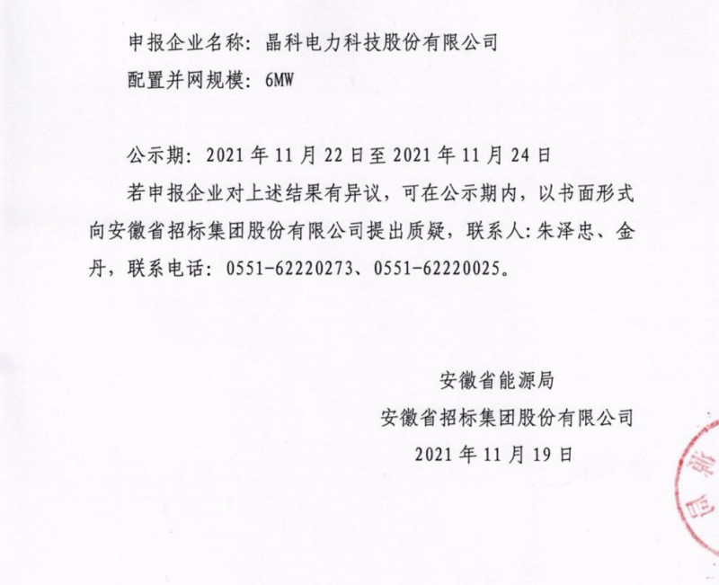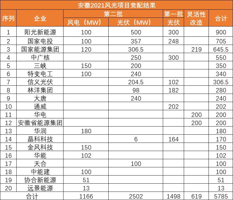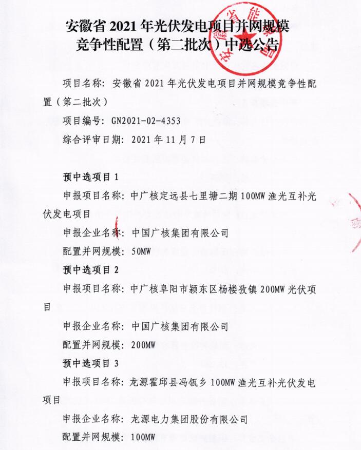 此前10月21日,安徽省能源局下發(fā)《2021年光伏發(fā)電項(xiàng)目并網(wǎng)規(guī)模競(jìng)爭(zhēng)性配置(第一批次)中選公告》,規(guī)模共計(jì)1498MW。中廣核、陽(yáng)光新能源、國(guó)家電投、通威、林洋、晶科、信義光能等7家企業(yè)中標(biāo)20個(gè)光伏第一批優(yōu)選項(xiàng)目。加上此次安徽省總共公示了4GW光伏、1.166GW風(fēng)電項(xiàng)目。