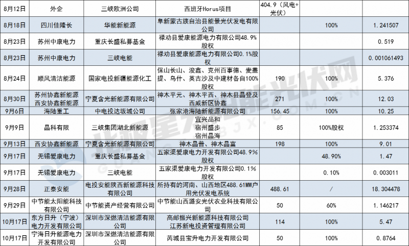 正泰之后,中廣核以658MW電站出售規(guī)模排名賣方市場第四。11月12日,新加坡勝科工業(yè)宣布已通過全資子公司勝科能源投資(上海)有限公司簽署股權(quán)購買協(xié)議,將以33億元收購深圳中廣核三期產(chǎn)業(yè)投資基金合伙企業(yè)及其附屬公司一項在營風(fēng)電和太陽能資產(chǎn)組合98%的權(quán)益,涉及電站10個,總裝機658MW。據(jù)了解,此次收購預(yù)計將于明年上半年完成。