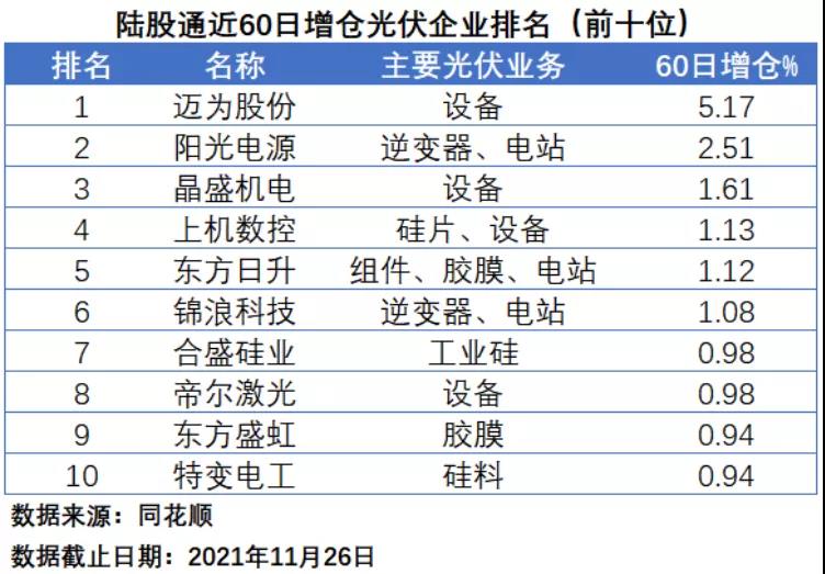 在陸股通近60日增倉(cāng)排名中,邁為股份、陽(yáng)光電源和晶盛機(jī)電分居前三位,增倉(cāng)幅度分別為5.17%、2.51%和1.61%,其中邁為股份和晶盛機(jī)電均為光伏設(shè)備企業(yè),前者的核心產(chǎn)品為太陽(yáng)能電池絲網(wǎng)印刷生產(chǎn)設(shè)備,后者主營(yíng)產(chǎn)品為晶體生長(zhǎng)設(shè)備。上機(jī)數(shù)控、東方日升、錦浪科技、合盛硅業(yè)、帝爾激光、東方盛虹和特變電工分居第四到第十位。前十名中,涉足光伏設(shè)備業(yè)務(wù)的企業(yè)高達(dá)4家,涉足電站業(yè)務(wù)的企業(yè)為3家。