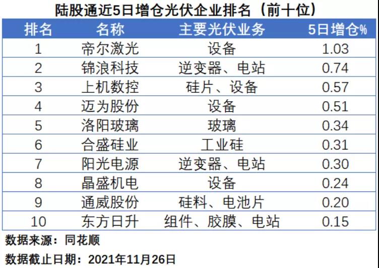 在陸股通近5日增倉(cāng)排名中,電池片生產(chǎn)設(shè)備廠商帝爾激光最受“北向資金”追捧,以1.03%的增持幅度排名第一,錦浪科技、上機(jī)數(shù)控以0.74%和0.57%位居第二和第三,邁為股份、洛陽(yáng)玻璃、合盛硅業(yè)、陽(yáng)光電源、晶盛機(jī)電、通威股份和東方日升位居第四到第十位。前十名中,涉足光伏設(shè)備領(lǐng)域的企業(yè)數(shù)量依然為最多,達(dá)到了4家。