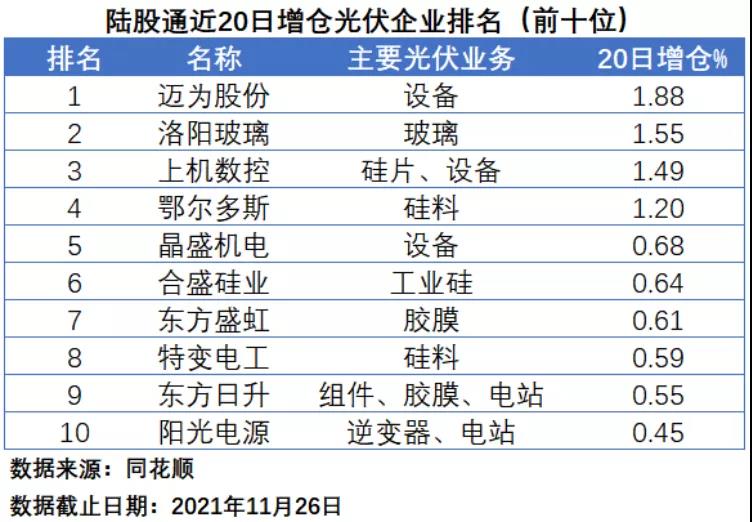 在陸股通近20日增倉(cāng)排名中,邁為股份、洛陽(yáng)玻璃和上機(jī)數(shù)控位居前三位,增持幅度分別為1.88%、1.55%和1.45%,值得一提的是,洛陽(yáng)玻璃于11月26日正式發(fā)布了產(chǎn)能擴(kuò)建計(jì)劃,未來(lái)公司在光伏玻璃領(lǐng)域的市場(chǎng)地位將進(jìn)一步得到鞏固;上機(jī)數(shù)控此前三季報(bào)業(yè)績(jī)不及預(yù)期,股價(jià)大跌,而“北向資金”則選擇了逆勢(shì)抄底。排名第四到第十位的企業(yè)分別為鄂爾多斯、晶盛機(jī)電、合盛硅業(yè)、東方盛虹、特變電工、東方日升和陽(yáng)光電源。