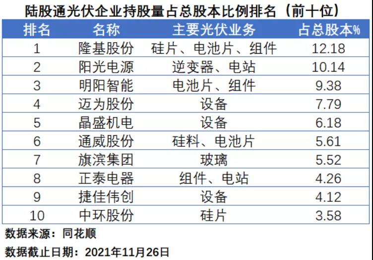 在陸股通持股量排名中,截止到11月26日收盤(下同),隆基股份憑借自身超強(qiáng)的綜合實(shí)力以及較高的總股本規(guī)模最受“北向資金”的青睞,以6.59億的持股量位居第一,通威股份和明陽(yáng)智能分別以2.52億和1.83億位居第二和第三。陽(yáng)光電源、東方盛虹、旗濱集團(tuán)、中環(huán)股份、特變電工的持股量均在1億股以上。在前十名中,共有4家企業(yè)涉足組件業(yè)務(wù),3家企業(yè)涉足電池片業(yè)務(wù),涉足硅料、硅片業(yè)務(wù)的企業(yè)各有2家。