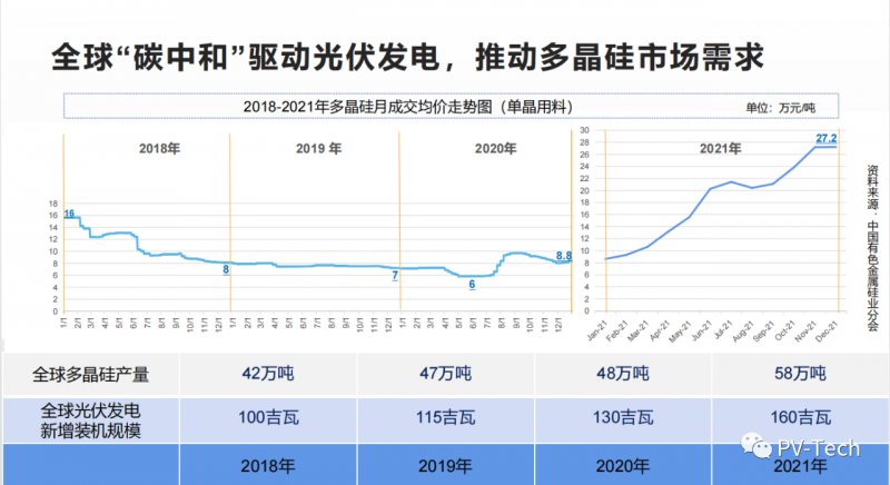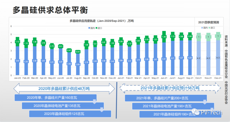 呂錦標(biāo)在報(bào)告里也公布了全球7家主要企業(yè)和4家新進(jìn)入企業(yè)的擴(kuò)產(chǎn)情況,預(yù)測(cè)2022年多晶硅供應(yīng)可以超過(guò)80萬(wàn)噸,比今年增加20萬(wàn)噸。主要產(chǎn)能集中在下半年投產(chǎn)。對(duì)應(yīng)明年200吉瓦的裝機(jī)預(yù)測(cè),多晶硅供應(yīng)大于需求。有望推動(dòng)價(jià)格下行。
