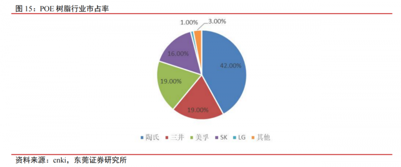 目前,陶氏化學(xué)以42%的市場份額,成為全球排名第一的POE樹脂龍頭公司,三井化學(xué)、美孚公司均以19%的份額分列二三位。