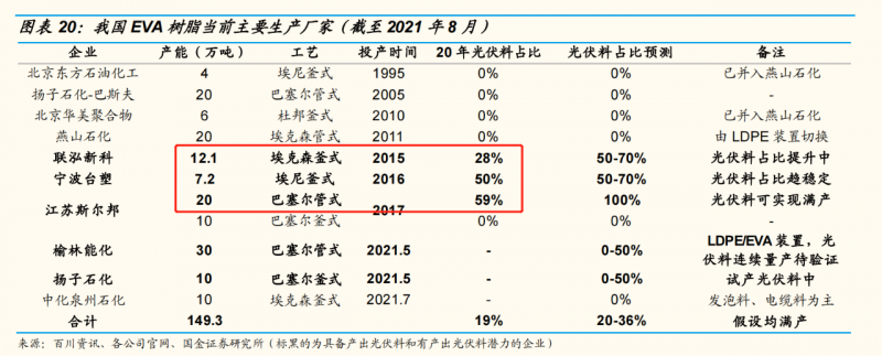 縱觀所有具備EVA產(chǎn)能的國內(nèi)企業(yè),能夠生產(chǎn)光伏級EVA的也只有斯?fàn)柊?、?lián)泓新科和寧波臺塑三家。榆林能化、揚(yáng)子石化、中化泉州石化均在2021年5-7月投產(chǎn)EVA材料,但暫未具備生產(chǎn)光伏級EVA的能力。